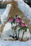 若い莟を摘み取って、わざわざ花期を遅らせて咲かせるのが冬牡丹。江戸期の歳時記『滑稽雑談』には「人巧をもって天地造化の力を盗んでこれをなす、まことに怪しむべきものなり」とある。知恵を持って自然の摂理を捻じ曲げた花ということであろうか。水巴の句、明日開く牡丹かもしれない。莟ゆえにひときわ色が鮮やかな冬牡丹である。(きぬた)